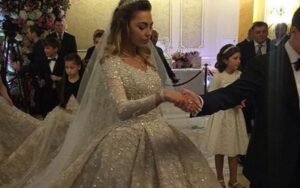 سارت العروس مرتديةً فستاناً من تصميم إيلي صعب، وزنه 28 رطلاً، مرصعاً بالكريستال والخرز، مما صعّب عليها المشي بمفردها. تحول موقع موسكو إلى جنةٍ زهرية، وغطت الزهور كل سطح من الجدران والأسقف.