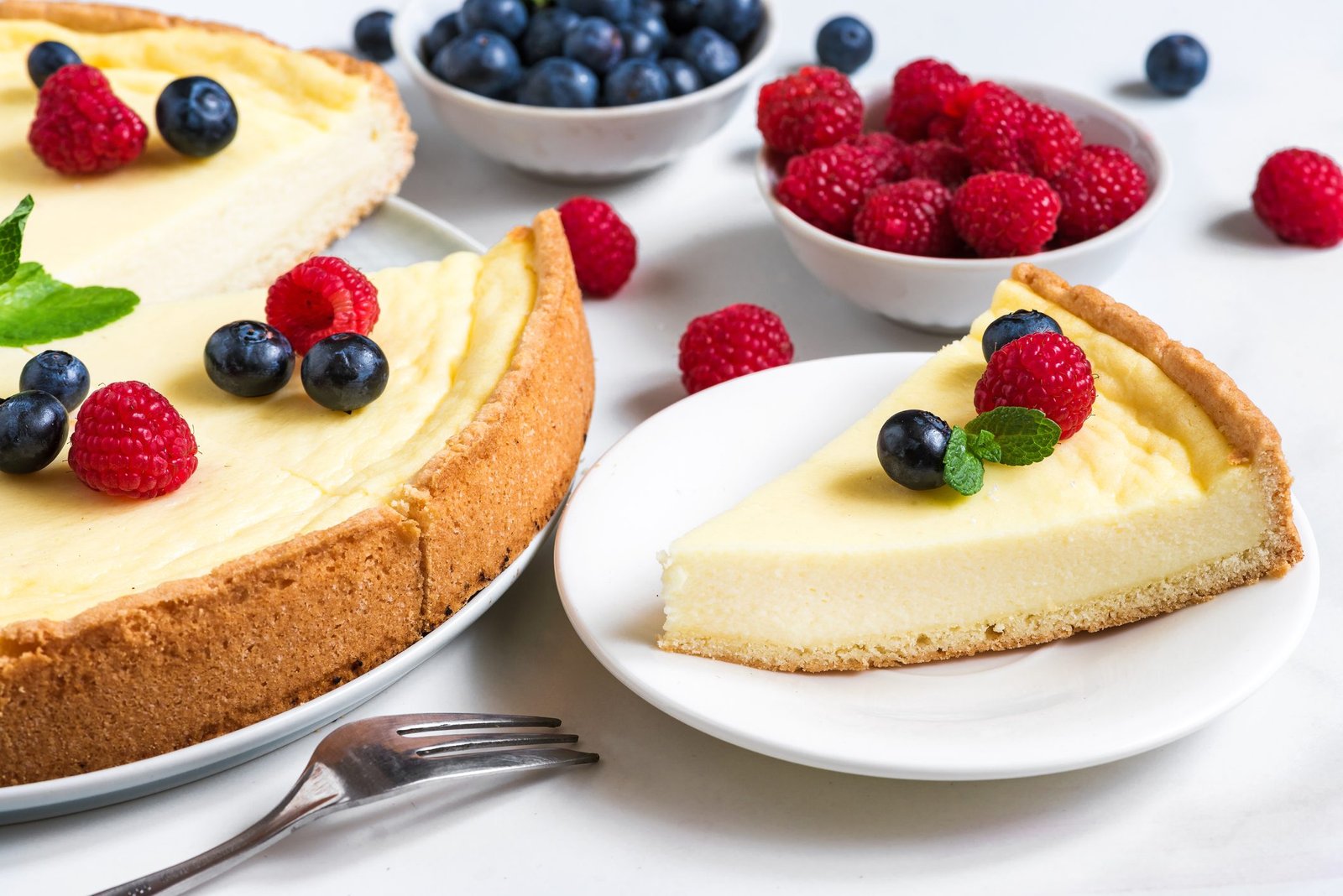 اخبزي التشيز كيك لمدة 45–55 دقيقة حتى يتماسك الوسط قليلاً مع بقاء طرفه ثابتًا.